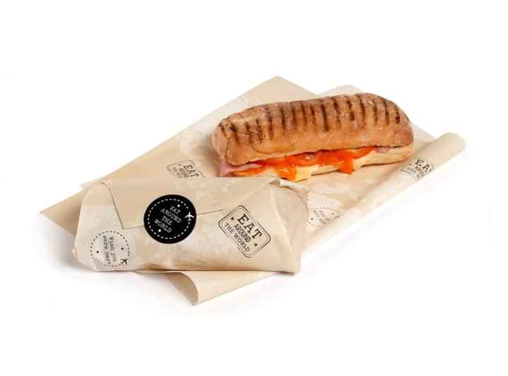 Use this multipurpose grease resistant paper for a world of street food inspired offerings. Kraft finish material featuring distressed map and passport stamp design – seal with the Street Sticker. Use this deli wrap sandwich paper to line lunch trays and boxes or pair with paninis, pittas, pizza, sandwiches, burgers, hot dogs, chips, and more.
