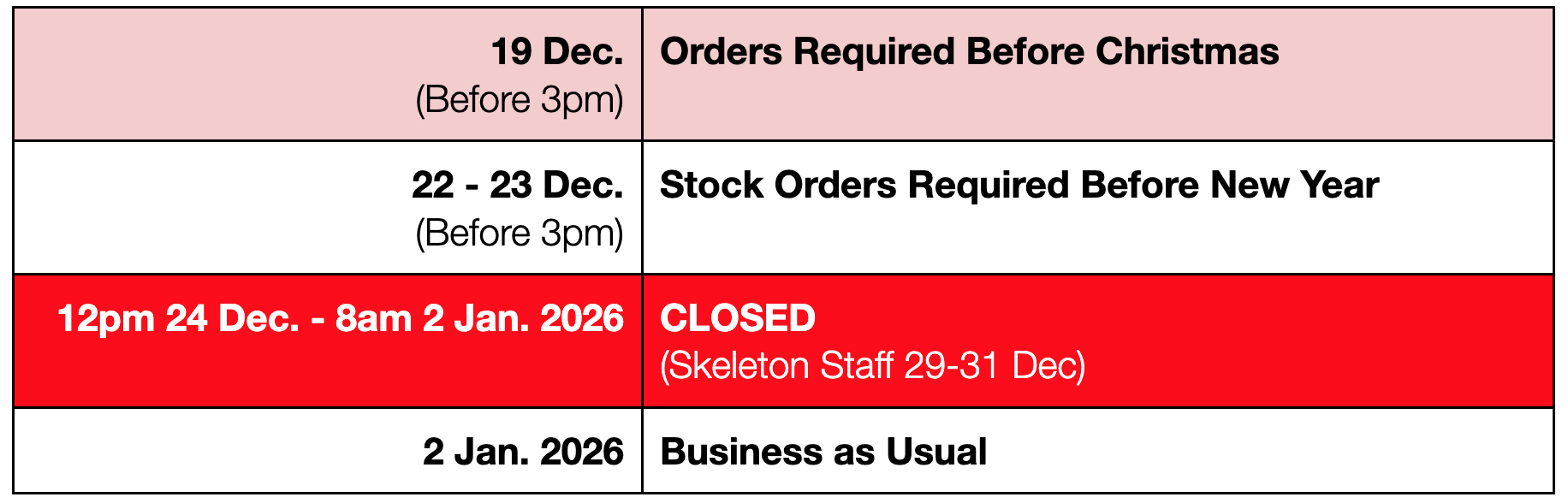We close for business at 12pm on the 24th December, re-opening on the 2nd January. Urgent matters and essential support will be provided by our team of Christmas elves on the 29th - 31st December. If you require goods before Christmas please place your order by 3pm on the 19th December. Orders placed on 22nd - 23rd December may be delivered during the festive period. Goods ordered from the 24th December onwards will be processed from the 2nd January.