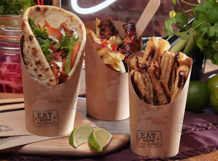 Sporting our best-selling Street Food brand which features a world-map with passport stamp design to suit a wide range of cuisines.