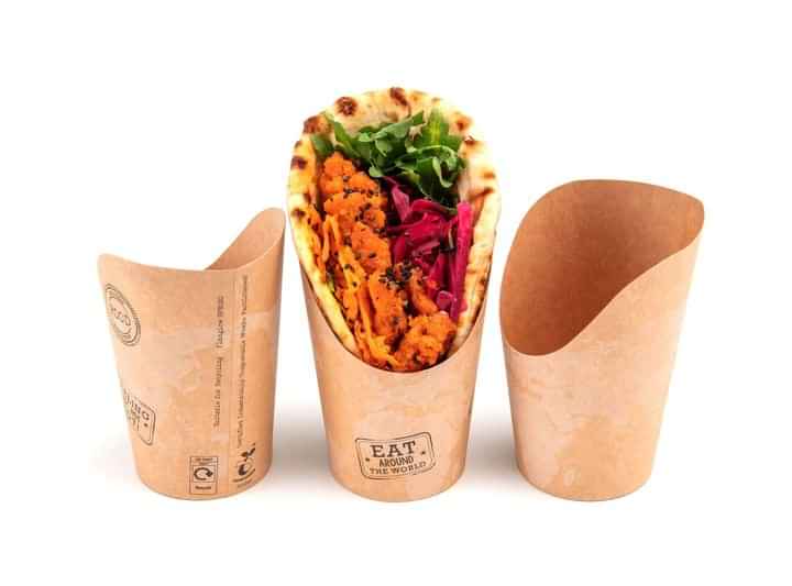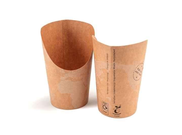 Want the inside scoop? It’s made from a premium double sided kraft board that’s printed with water-based inks and coated with a compostable liner. These chip cups are certified both recyclable and (EN13432) industrially compostable and may be composted at an industrial composting facility, where available.