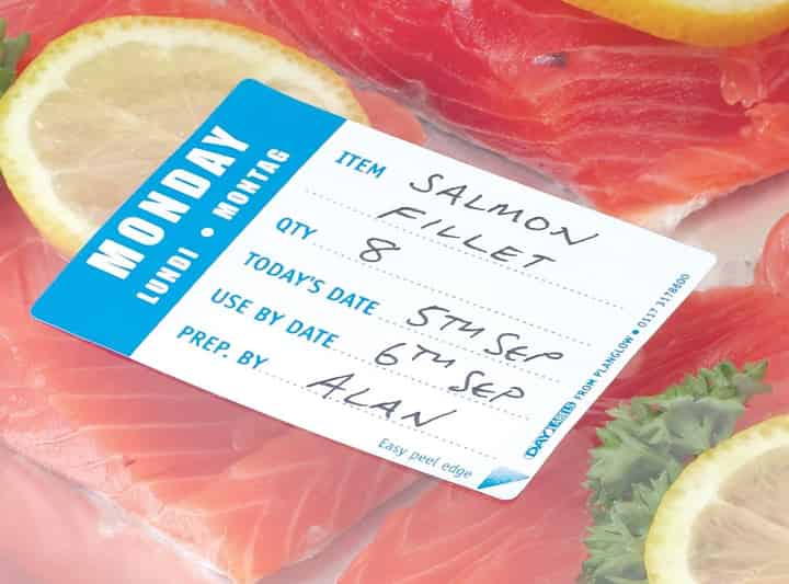 Tear off and fill in product, description, quantity, today's date, use by date and for extra accountability employees names. Label includes Easy Peel feature.
