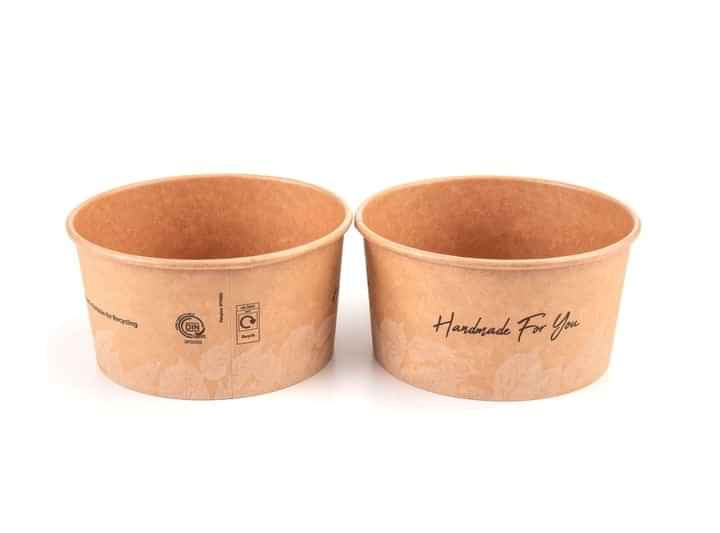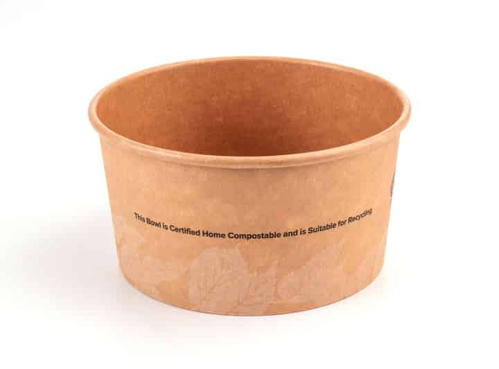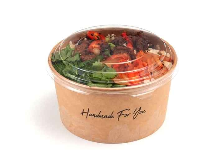 Made from a renewably managed aqueous-lined kraft board, this takeout bowl is certified home compostable as well recyclable to ORPL standards. It combines our Back to Nature leaf on kraft print design and ‘Handmade For You’ messaging with a broad circumference (150mm) and excellent thermal properties to offer a clear and complementary presentation of foods hot and cold. Pair this natural disposable food containers with our anti-fog clear rPET lids to stack in a chiller.