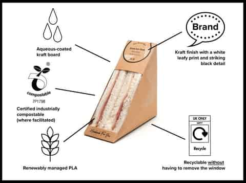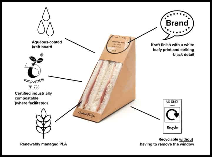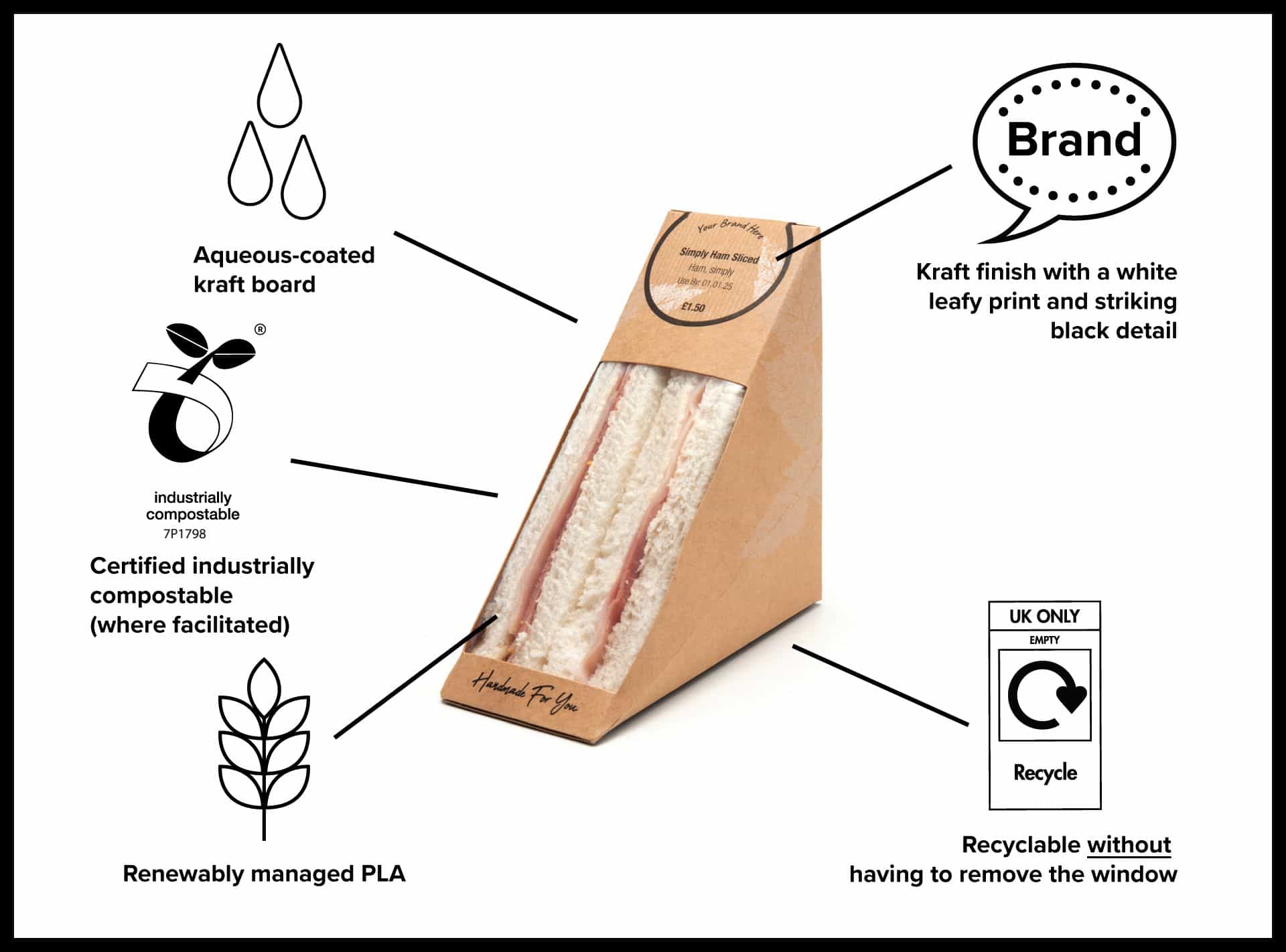 This wedge is a first, this slimline pack is certified industrially compostable and recyclable without removing the window. Made from cutting-edge aqueous lined, premium, double sided kraft board with a PLA window, it features a white leaf print and ‘Handmade for You’ messaging. Supplied flat-packed, it offers a two-day shelf-life and meets ORPL standards for recycling, all materials come from renewably managed plant-based sources.