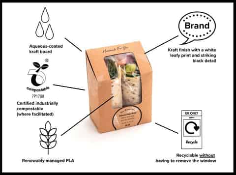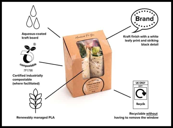 Premium double sided kraft board (featuring a white leaf print and ‘Handmade For You’ messaging) with a cutting-edge plant-based aqueous coating and PLA window. Supplied flat-packed, this tuck-top industrially compostable wrap pack is made from renewably managed materials. Recyclable to ORPL standards, unlike many, without removing the window.