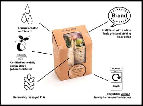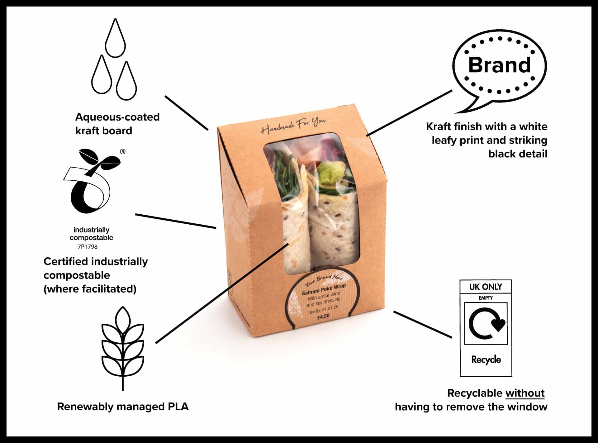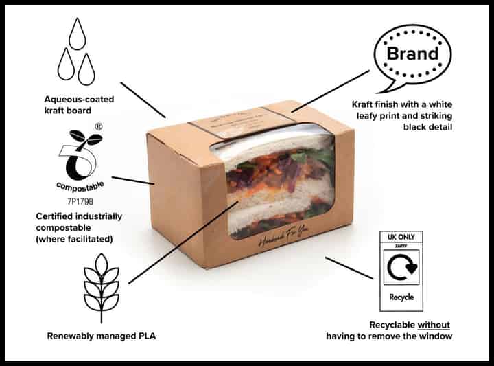 Plant-based certified industrially compostable sandwich box made from renewably managed cutting-edge Aqueous kraft board with a PLA window, offering a two day shelf life and recyclability (to ORPL standards) which, unlike some products, is without removing the window. Combines white leaf print and ‘Handmade for You’ messaging with a natural kraft finish.