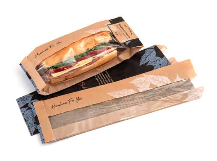 Our baguette sandwich bags are entirely paper based - including the clear window which is made from Natureflex - a certified home and industrially compostable film derived from wood pulp - suitable for hot and cold foods and up to 24hr use.