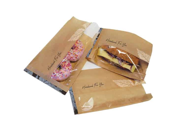Versatile grease-resistant bags for hot and cold foods: paninis to pastries and everything in between. Suitable for 24hr use, they have a large Natureflex window which is a certified home and industrially compostable film derived from wood pulp. Featuring a bold black base and white leaf motif, our Back to Nature Multi Bag Bag is also printed with ‘Handmade For You’ messaging. Seal with a label or Back to Nature sticker.