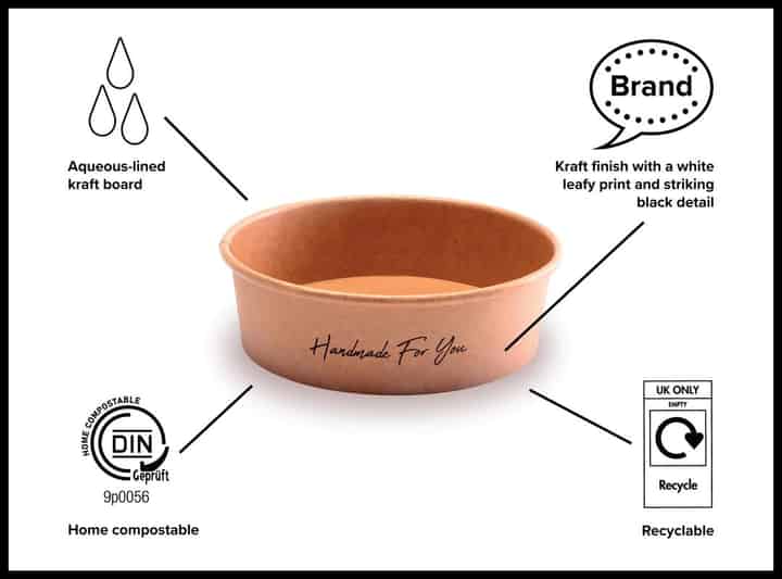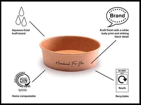 Get back to nature with our 500ml recyclable (ORPL) and certified home compostable food bowl which features our subtle Back to Nature leaf print. Made from a renewably managed aqueous-lined kraft board with outstanding thermo insulation, it may be paired with both hot and cold foods. With the same wide angle (150mm) as our two larger size bowls, this container is a little shorter for lighter bites and greater portion control. Finish with our clear anti-fog lids (LID011) which are made from rPET and support a stackable, on-the-go solution