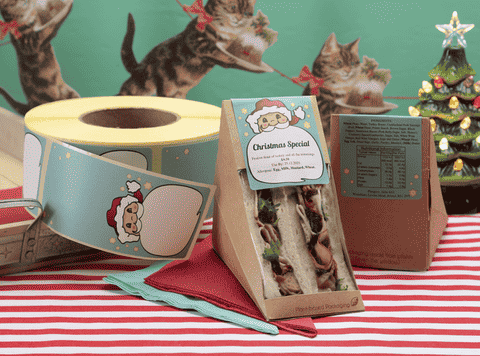 Santa's on a roll! Available on a shorter 500 label roll, this seasonal label design is roomy enough to accommodate all of your nutritional labelling needs. Suitable for use with roll label printers with thermal transfer ribbons, pair this Natasha’s Law compliant label with delicious Christmas sandwiches and yuletide treats. Breakseal-forming fold-over design displays core product information front of pack while nutritional data, barcodes and allergen information may be printed on the back. Also available as a sheet label.