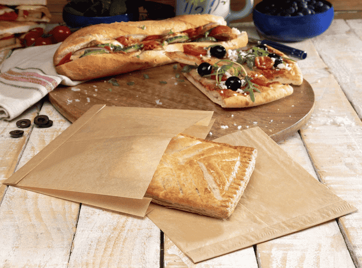 Kraft paper hot bag for toasted sandwiches, pastries, pizza and more. This multi-tasking hotshot can handle temperatures up to 220°C allowing you to store pre-prepared food items in both hot cabinets and chillers alike - heat with a contact grill / grill press as and where required. Supports an altogether cleaner cooking environment and helps to reduce cross contamination from allergens (such as melted cheese).