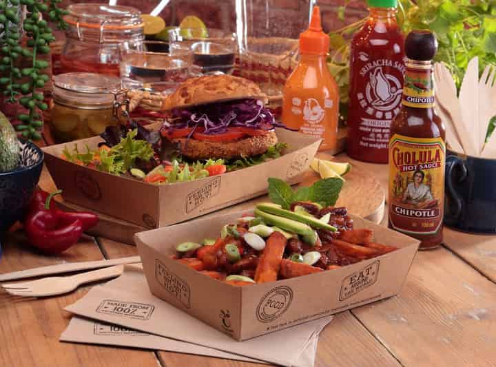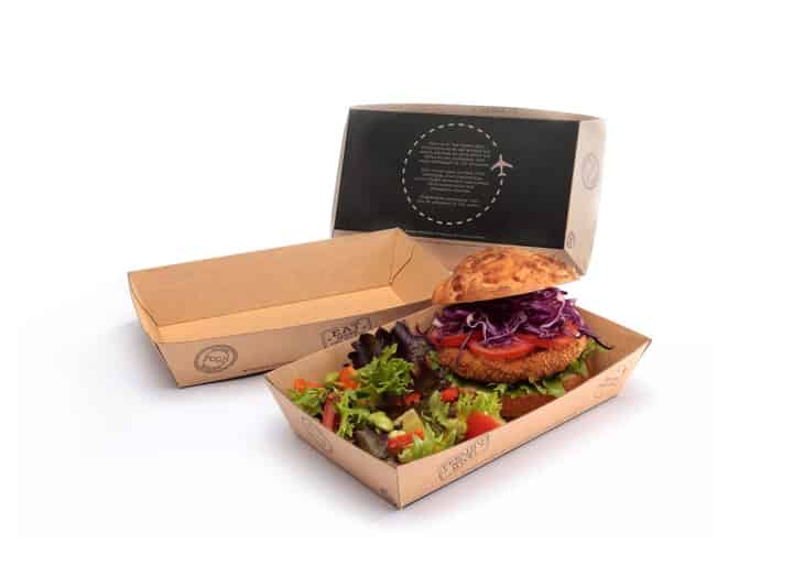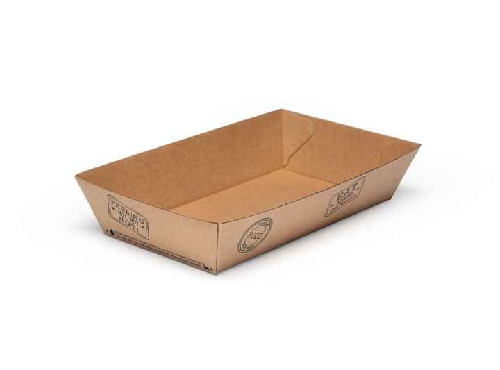The kraft food tray is the main event. Made from a corrugated kraft board, the disposable food tray is certified home and industrially compostable while also protecting against leaks and seeps. Sporting our signature passport stamp print, the sturdy construction is suitable for a wide variety of street eats, takeaways and festival-fare: from burgers and fries, to paella or pies and a whole lot in between. Consumers can take the robust kraft food tray out into the crowd or simply reheat at home.