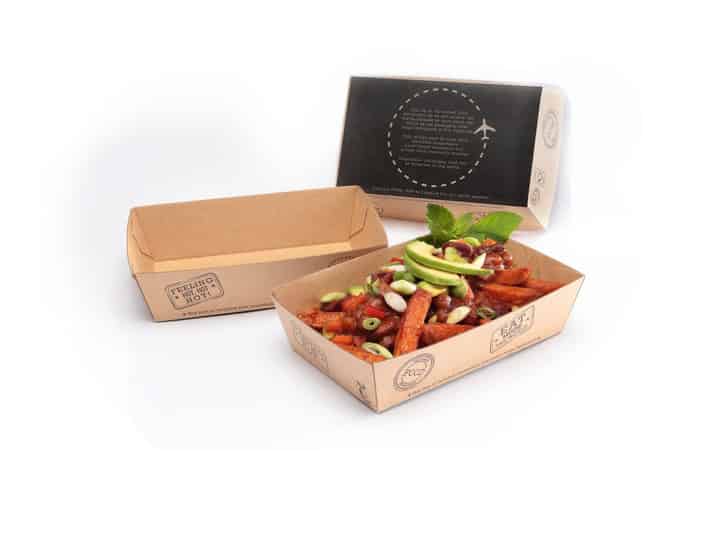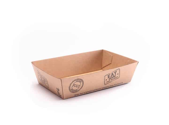 A recyclable, home and industrially compostable fast food tray, it is made from a premium, sustainably sourced material (double-sided corrugated kraft board) with a stackable, sturdy construction to protect against leeks and seeps.