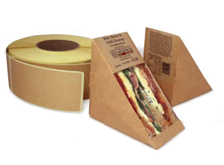 Kraft effect label for creating a natural rustic look, suitable for deep-fill wedges the fold-over design also provides a break seal. Perfectly sized to comply with Natasha’s law, plus additional room for RI’s, barcodes and a nutritional box.